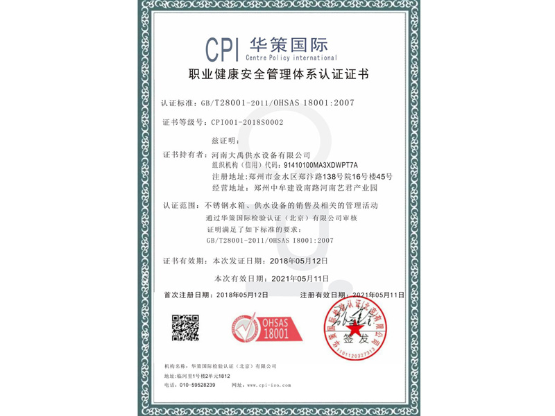 職業健康安全管理體系認證證書